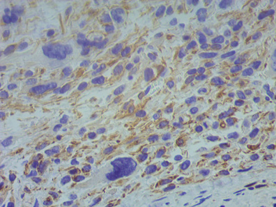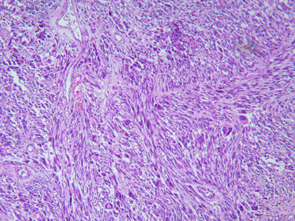During her postoperative period, course with satisfactory evolution, 3 erythrocyte concentrates and 1 plasma were transfused, after 48 hours a histopathological report is reported with the report of spindle cell variant uterine leiomyosarcoma with tumor site anterior uterine wall and fundus. Figure 1, Figure 2 It is concluded with gynecological oncology in uterine sarcoma EC IB with probable metastasis.