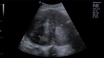 Admission laboratories highlight the blood count with leukocytes: 8000, hemoglobin 8g/l, hematocrit: 24%, platelets 250,000,000, rest of laboratories without alterations, ultrasonography 11.28.2021 tumor in pelvic cavity dependent on uterine body of 14 is reported cm, heterogeneous, with fine echoes inside, without data of vascular alterations, endometrium not visible, ovaries not visible (Image 1).