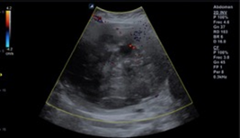 Image 1 Pelvic ultrasound. The anatomical topography of the uterus shows the presence of an oval image with lobulated edges and heterogeneous echogenicity due to solid areas with a cystic appearance (white arrow), which shows partial flow saturation after applying the color Doppler modality.