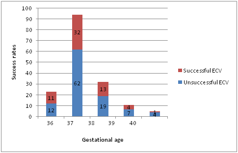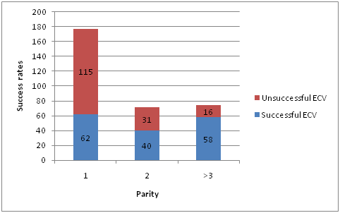Factors which were studied to determine to association with ECV success rates included parity, BMI, mode of administration of tocolytic, operator seniority and spontaneous reversion rates after a successful ECV. Complications included antepartum haemorrhage, non-reassuring CTG, and the requirement for emergency caesarean section