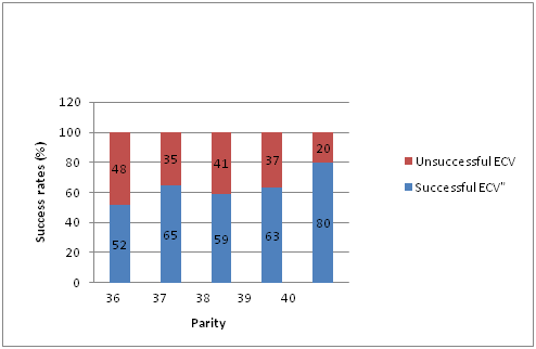 There was a direct correlation between success rates and parity, with a 34% (61/177) success rate in nulliparae compared to 68% (100/148) in multiparae (58% for Para 1, 80% for Para 2 and 77% for Para 3+, see Graph 1). Women who were Para 2 or more were most likely to have a successful ECV (P=0.0008). Success rates were 52%, 65%, 59%, 63% and 80% at 36,37,38,39,40 weeks gestation respectively, (Graph 2 & 3). There was no correlation between BMI and success rates (P=0.47), nor was there a correlation with morbid obesity, defined as a BMI >40kg/m2 and success rates (P=0.3). Of the total number of ECVs, 78% of cases were performed by consultants. First consultant performed 105 and the other 44, with success rates of 63% and 70% respectively. The mode of delivery for successful and unsuccessful ECVs is outlined in Table 2.