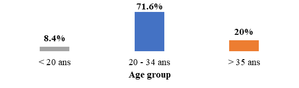 The mean age of the patients was 28 years, with extremes of 15 and 43 years. The 20-34 age group was the most represented (71.6%) (Figure 1).