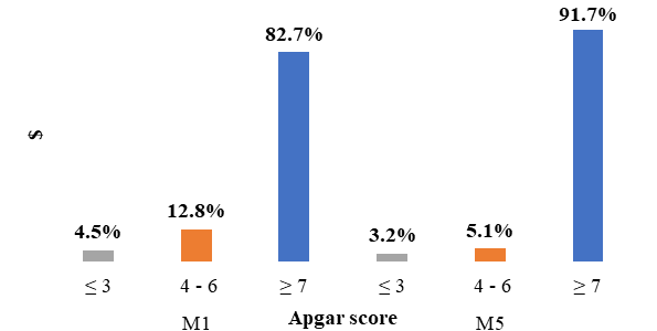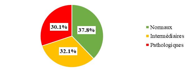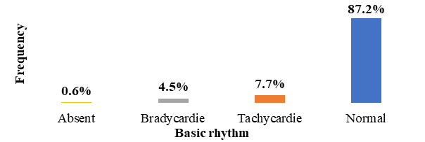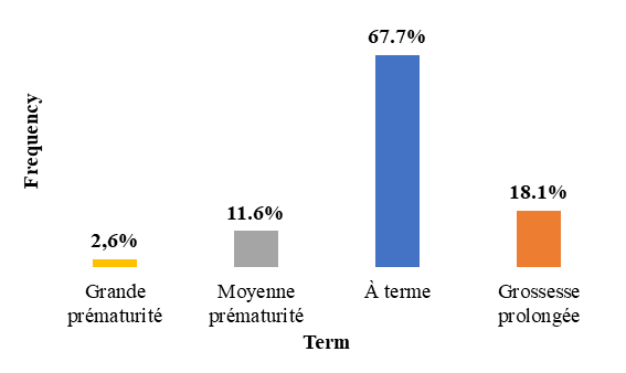 Data were entered using Excel and analysed using SPSS version 22. In the descriptive analysis, the qualitative variables were described in terms of numbers and percentages, and the quantitative variables in terms of mean, standard deviation, extremes and median. For the analytical part, the Chi-square test was used to compare proportions. The difference was statistically significant when the p-value strictly less than 0.05. The rhythm is normal when it is between 110 and 160 beats per minute (bpm). Tachycardia is defined as a rhythm greater than 160. The cardiwas otocograph results were interpreted using the classification of the French National College of Gynaecology and Obstetrics (CNGOF) published in 2007. Tracings with a low to moderate risk of acidosis were classified as intermediate and those with a high or major risk of acidosis as pathological. An APGAR score of less than 7 at 1 minute was defined as neonatal asphyxia.