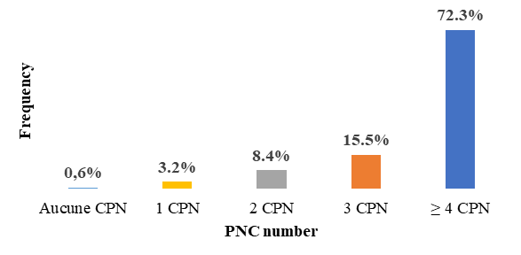 Nearly ¾ of patients (72.3%) had attended at least 4 antenatal clinics (ANC). One patient (0.6%) had not attended any ANC (Figure 3).