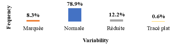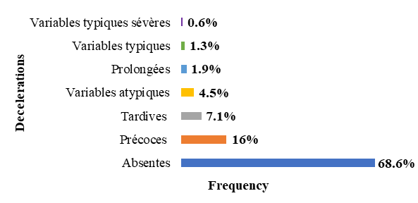 Among the pathological FHR tracings, we recorded 12.8% abnormalities of the basic rhythm, 21.1% abnormalities of variability and 31.3% decelerations. Basic rhythm abnormalities were dominated by tachycardia (7.7%) followed by bradycardia (4.5%). Mbaye10 reported a higher proportion of bradycardia (11.8%). However, his rate of tachycardia was lower than ours, estimated at 6.4% of FHR abnormalities. When bradycardia is persistent and severe, or when it is associated with a lack of variability, it is considered to be at high risk of foetal acidosis [80]. This is confirmed by our results. In our study, bradycardia was associated with 57.9% of neonatal asphyxia (p =0.001). On the other hand, moderate and isolated tachycardia is not associated with an unfavourable neonatal outcome except in cases of maternal infection.14
