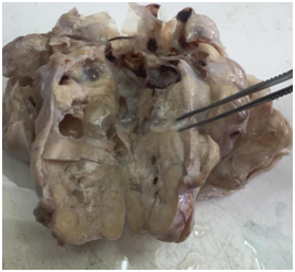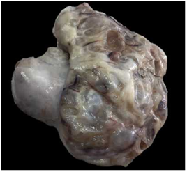 On gross examination, a well encapsulated, multinodular cystic tumor of left ovary about 17×14×7cm was identified (Figure 1). Cut surface was mostly solid with few cystic areas. On cut section hemorrhagic fluid came out (Figure 2). Uterus, cervix, right ovary and both tubes were unremarkable.
