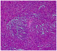 Fibrothecomas of ovary constitute about 4% of all ovarian tumors. They represent a group of benign tumors arising in stroma and exhibit a morphological spectrum consisting of entirely fibroblasts and producing collagen (Fibromas) to those containing more plump spindle cells with lipid droplets (Thecomas). When a tumor contains mixture of these cells, they are termed as fibrothecomas. . Also, they have been reported to show myxoid change and degeneration. These tumors occur at all ages, but are more frequent during middle age.1