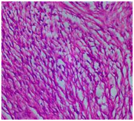 Case: A 45 year old female presented with large abdominal lump of 20 weeks size associated with pain abdomen. She was admitted for management and evaluation. Hematological and biochemical parameters were normal. USG revealed a large multilocular, predominantly cystic lesion 20.9x9.6x11.4 cm in pelvis. CECT revealed ovarian cystadenocarcinoma left ovary with locoregional mass effect, mild ascites and suspicious metastasis to internal iliac lymph nodes. Hence panhysterectomy and omentectomy was performed as radiological and preoperative clinical diagnosis was malignant ovarian tumor. On gross examination, a well encapsulated, multinodular cystic tumor of left ovary about 17x14x7 cm was identified. Cut surface was mostly solid with few cystic areas. On microscopic examination, multiple sections showed spindle shaped cells in storiform and palisading pattern. No mitotic activity was identified. On special staining, it was positive for vimentin. Hence, final diagnosis came to be as benign fibrothecoma of ovary