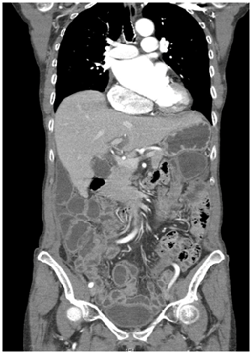 Five months from the first diagnosis and after bibliographical reviews and several meetings with the tumors committee, we decided to do citorreduction surgery. The peritoneal carcinomatosis index (PCI) was 20 in the laparotomy and we achieved a citorreduction coefficient of 0 (CC0) after surgery. During the post‒surgery period the dehiscence of ileocolic and colorectal anastomosis complicated the clinical course with ileostomy. The patient evolved satisfactorily.