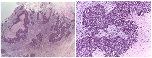 Figure 2 Low power view of neuroendocrine carcinoma showing solid nest and trabeculae with necrosis.