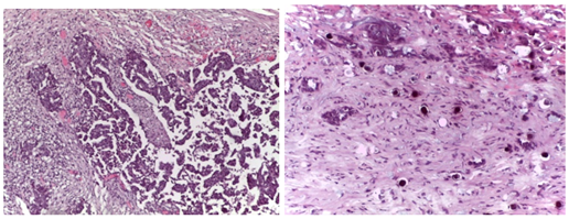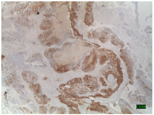 The histopathology showed ovarian and peritoneal invasion by high‒grade carcinoma with neuroendocrine differentiation. Pathology examination showed a tumour composed of two different components, the larger of them was characterized by a dense population of medium ovoid and fusiform cells, arranged in solid nest and trabeculae with central necrosis (Figure 2). The tumours cells have scant cytoplasm and hyperchomatic nucleus with “salt and pepper” chromatin. The smaller component consisted of papillary and glandular epithelial structures, with severe atypia and frequent Psammoma bodies (Figure 3). These features were characteristic of non small cell neuroendocrine carcinoma (NSCNEC) plus High‒Grade serous carcinoma.