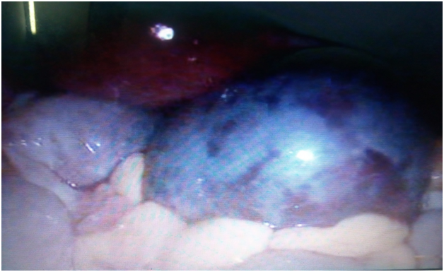An 18 year old, unmarried girl presented to the emergency department with chief complaints of dull aching pain in the right iliac fossa since one day. The pain was waxing and waning in nature associated with a few episodes of acute exacerbations in the last 24 hours. Patient also had 2-3 episodes of non- bilious vomiting and constipation. Past history revealed that she was a known case of polycystic ovarian disease and had a similar episode of acute abdomen 5 months back which was conservatively managed and she was advised a 3 month course of oral contraceptive pill. Previous ultrasounds showed a persisting follicular cyst of around 5 cm in the right ovary along with bilaterally enlarged ovaries with peripherally arranged multiple small follicles. Patient had oligomenorrhoeic cycles and rest of the medical and surgical history was not significant. There was no history of fever, loss of appetite, vaginal discharge or urinary symptoms. Abdominal examination did not reveal any mass in the right iliac fossa but rebound tenderness was present. Blood investigations were sent along with CA-125 which were all found to be normal. Transabdominal scan revealed an enlarged right ovary with a clear cyst of 71x57x65mm along with a thick wall. Left ovary was also enlarged with peripherally arranged follicles and a simple cyst of 28mm. Colour Doppler revealed normal blood flow in both the ovarian vascular pedicles. Since the patient was a known case of PCOD, presence of enlarged ovaries with a persistent follicular cyst and normal blood flow, only made the diagnosis of torsion more challenging. But, considering the recurrent episodes of acute exacerbation, vomiting and persistent dull aching pain, authors decided to go for a diagnostic laparoscopic evaluation in order to rule out ovarian torsion.