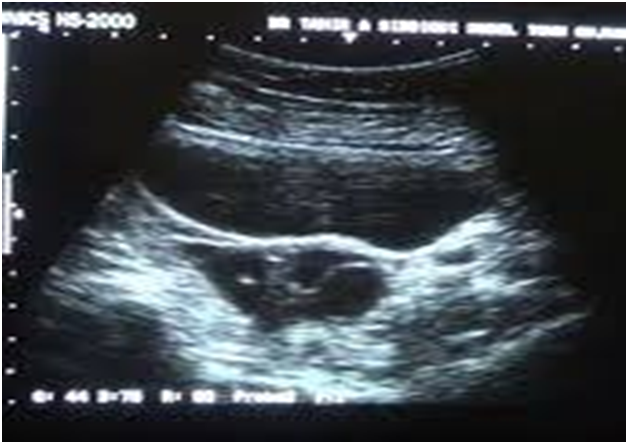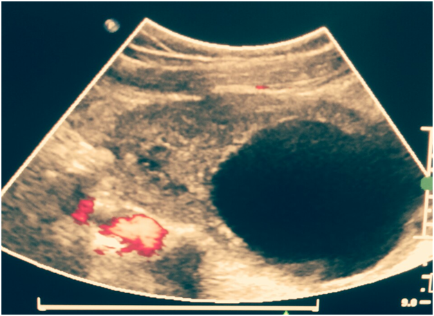 Intraoperatively, right adnexa was twisted for three and half turns on its pedicle and appeared bluish black, edematous and congested suggestive of haemorrhagic necrosis. Following detorsion, right tube immediately gained colour and the right ovary also began to regain its colour slowly in the periphery. On attempting cystectomy, cyst ruptured and drained hemorrhagic fluid, the surrounding ovarian tissue was highly edematous and friable. Cystectomy was done with removal of the surrounding blackish and friable tissue. Rest of the ovary near the hilum was preserved despite, it appearing bluish-black and edematous. Left ovary was enlarged with multiple small follicles and a 3x2 cm haemorrhagic cyst was found which was also excised. Post operative period was uneventful and the patient was discharged the next day with a 5 day course of antibiotics and analgesics. A follow up scan was done after 6 weeks which revealed remnant ovarian tissue on the right side along with good follicular activity and normal blood flow (Figures 1-3).