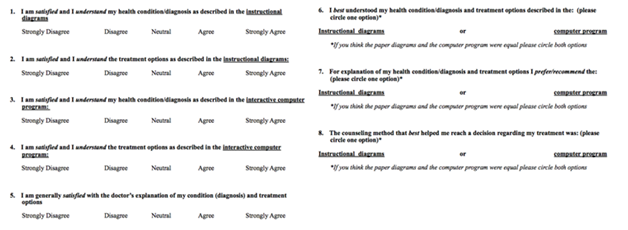 Subjects’ age, race, and diagnoses were recorded. All patients were counseled regarding diagnosis and treatment options, specifically surgical treatment, for SUI and/or POP using traditional diagrams (TD) from Boston Scientific with relevant pelvic floor anatomy images, followed by counseling with a web based CAI [http://bsci-popq.com/intro.html ©2017 Boston Scientific Corporation] guided by the treating physician on a desktop computer (Appendix 1). Both methods of counseling were provided by the treating physician and outside of the visual aids employed, the verbal counseling was the same for both methods. After receiving both counseling methods, patients gave verbal consent to the study, and completed an eight-question survey (Figure 1). Questions 1-5, which asked patients to rate their satisfaction with the counseling methods provided, were adapted from the questions in the validated Satisfaction with Decision Scale.12 The last three questions were designed as a head to head comparison of counseling modalities in regards to ease of understanding, mode of information delivery, and assistance with health care decision making. The investigators added the eighth question, regarding the impact of counseling method on medical decision-making, after patient enrollment began.