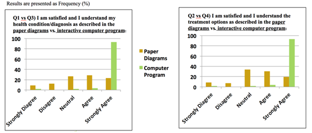 Regarding patient diagnoses, 42% of patients had SUI, 41% had POP and 8% had both conditions. Responses to the Likert scale questions indicated higher frequency of patients were strongly satisfied with their understanding of their health condition (93% vs. 23%) and treatment options (93% vs. 20%) when counseled with CAI as opposed to TD (Figure 2). Comparing question 1 to question 3, there was a significant difference in the proportion of patients who were satisfied with TD and unsatisfied with the CAI (proportion=1.8%) vs. the proportion of patients who were satisfied with the CAI and unsatisfied with the TD (proportion=46.4%), p-value<0.001 as a method of understanding the diagnosis. Comparing question 2 to question 4, there was a significant difference in the proportion of patients who are satisfied with TD and unsatisfied with the CAI (proportion=0.0%) vs. the proportion of patients who are satisfied with the CAI and unsatisfied with the TD (proportion=46.4%), p-value<0.001 as a method of understanding the treatment.