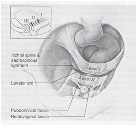 DeLancey has also identified these defects according to the levels of support in 1992. He identified the three levels of pelvic support, the uterosacral-cardinal ligament complex (Level I), the paravaginal supports namely pubocervical and rectovaginal fascia (Level II), and perineal membrane and perineal body (Level III). The accompanying the symptomatology of the prolapse may be explained by the defects in the supports. The symptom common to all types of prolapse is usually an introital mass or vaginal bulge.