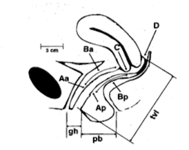 Pelvic Organ Prolapse is staged using the International Continence Society (ICS) Pelvic Organ Prolapse Quantification System (POP-Q) which was introduced in 1996.9 This staging presents a standard system of terminology approved by the International Continence Society, the American Urogynecologic Society, and the Society of Gynecologic Surgeons in describing the female pelvic organ prolapse and pelvic floor dysfunction. It is an objective site-specific system for describing, quantitating, and staging pelvic support in women is included. POP-Q introduces the 9-point grid, which identifies the different compartments of the pelvis (Figure 1).