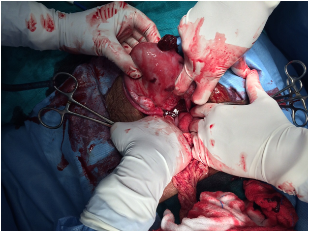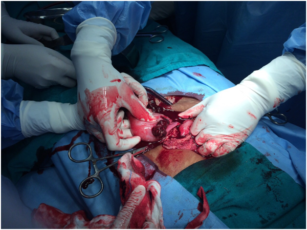 Her haemoglobin was 6.3gm/dl and the rest of her blood investigations were normal. Urine pregnancy was still positive with β-HCG-2,11,000 IU/ml. Chest X-ray was normal. Ultrasound revealed bulky uterus with lesion measuring 25x23mm on posterior wall with increased vascularity. Bilateral adnexa was normal with free fluid present in POD. Patient was planned for emergency laparotomy after arranging three unit packed red cells. Injection methotrexate 50mg IM given stat. Per operative 1200cc of haemoperitoneum was present, uterus was 8 weeks in size with 3cm perforation seen at fundus with polypoidal mass protruding at through it (Figure 1 & 2).