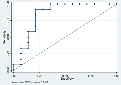 Using the ROC curve, it was evidenced that average lung volumes less than 34.9cm3 presented mortality of 56.1% (Figure 2) with a sensitivity of 83.33% and a specificity of 78.57% to predict mortality.