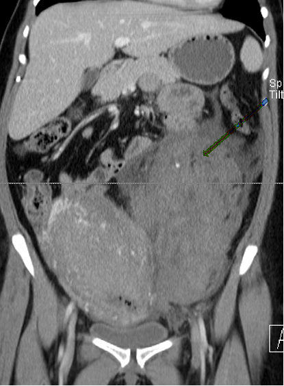 Figure 1 Coronal image of CT abdomen and pelvis demonstrates a large left pelvic and retroperitoneal hematoma extending up to the level of the kidney with mass effect on surrounding structures.