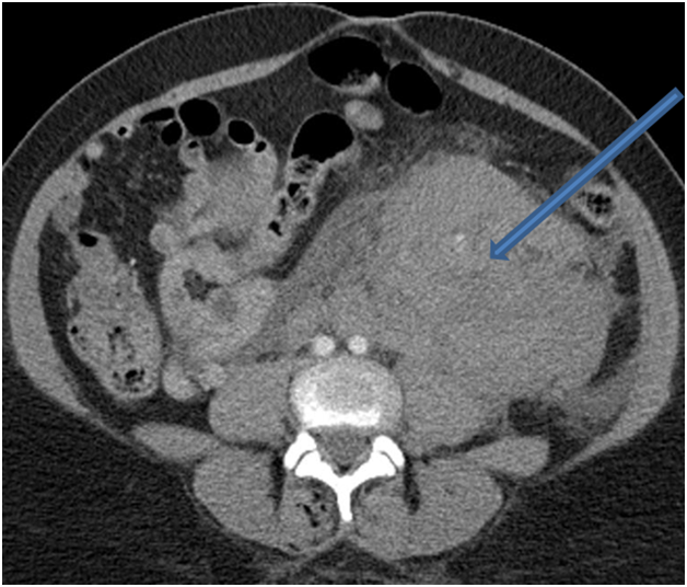 Figure 2 Axial CT image of abdomen and pelvis demonstrates a large left pelvic and retroperitoneal hematoma.