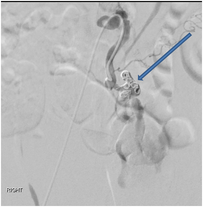 Figure 3B Pseudo-aneurysm was successfully embolized using 6, 8, and 10 mm nester embolization coils as well as Gelfoam slurry.