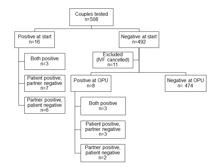 Results: A total of 508 couples were tested. Of the 508 cycles of therapy, 24 (4.7%) were cancelled, 16 (3.14%) before the start of the cycle, and 8 (1.66%) before ovum pick-up, because one or both partners in the couple tested SARS-CoV-2 positive. Before the start of the cycle, 3 patients and their partners both tested positive; 7 patients tested positive and their partners tested negative and 6 partners tested positive and the patient testing negative. In addition, on retesting 481 couples before OPU 3 patients and their partners both tested positive; 3 patients tested positive, and their partners tested negative; and 2 partners tested positive and the patients tested negative.