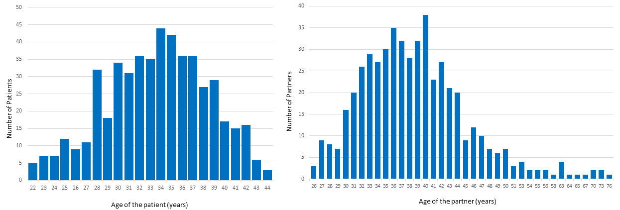 A total of 508 couples participated in the study. The patient selection and testing process is shown in Figure 1. The majority of patients (71%) were aged 36 years or less with a median age of 34 years (Figure 2a), and the majority of their partners (71%) were aged 40 years or less with a median age 38 years (Figure 2b). The majority of patients (n=354, 69.7%) received the GnRH antagonist protocol; 114 (22.4%) received the long protocol; 24 (4.7%) received the short protocol; and 16 (3.2%) cancelled prior to the start of IVF (Table 1).