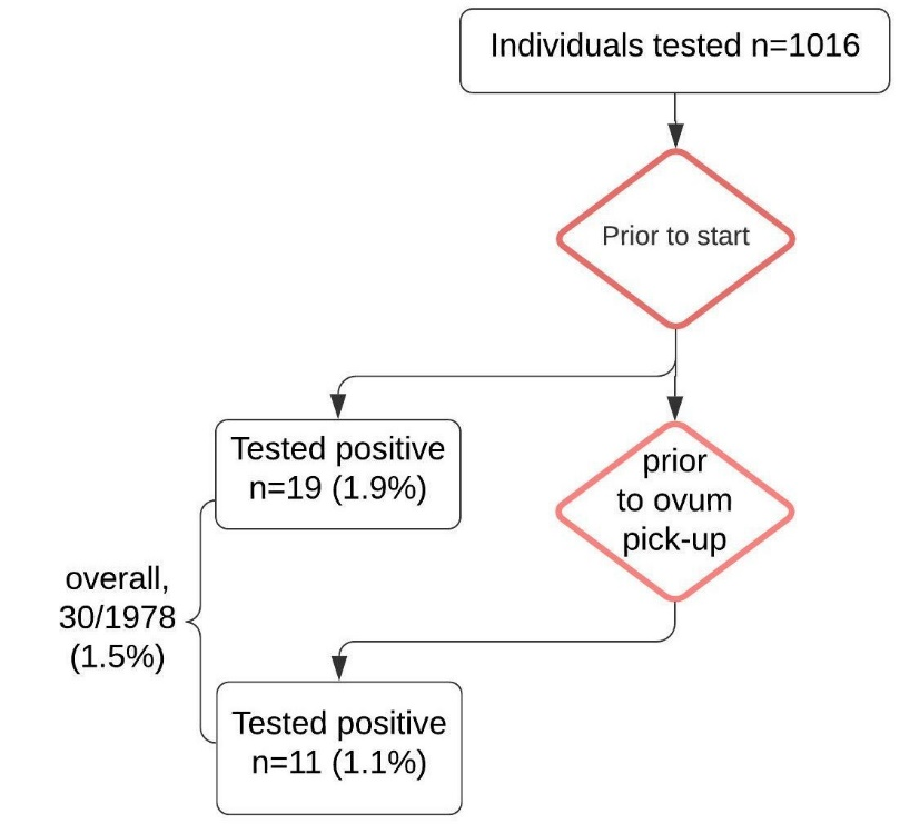 Out of the 508 patients scheduled to have IVF treatment, we cancelled a total 24 treatments (4.7%), 16 (3.14%) before starting the ovulation cycle, and 8 (1.66%) before OPU because one or both members of the couple tested SARS-CoV-2 positive (Figure 1). Three couples tested positive at start of the cycle; and additional 7 patients tested positive with their partners testing negative and 6 partners tested positive with the patient testing negative. In addition, on retesting before OPU, 3 of the 481 tested positive; an additional 3 patients tested positive with their partners testing negative and 2 partners tested positive with the patients testing negative. Prior to the start of the cycle, of 1016 individuals tested, 19 (1.9%) tested positive; on retesting prior to ovum pick-up, of the 962 individuals tested 11 (1.1%) tested positive; and of the individuals tested positive as shown in Figure 3.