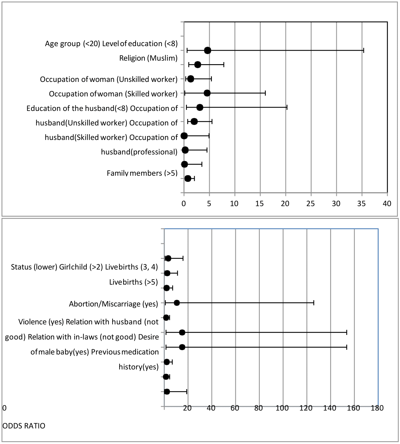 The relation to obstetric history in present study also demonstrate high odds ratio (10.6) for depression in participants with higher parity and abortion. Regarding parity, literature reports higher incidence of depression in primigravida and primiparous females.21 In present study, the socio-economic burden of large family may have acted as a contributing factor with high parity.