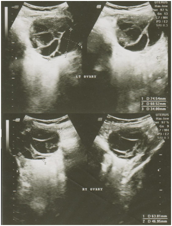 Ultrasound revealed small renal calculi in left kidneys with a normal pelvi-calyceal system. Uterus was normal with endometrial thickness of 6.89 mm. Both ovaries were markedly enlarged (right – 78.33 cc, left 124 cc), with multiple follicles 15-34 mm in size (Figure 1). Tumour markers (beta hCG, alpha-fetoprotein and Ca-125) were within normal limits. Thyroid functions revealed a high TSH (142.1) with high values of anti-thyroperoxidase (423.7). Other hormones (FSH, LH and Prolactin) were normal. Treatment was started with levo-thyroxine 50 µg, that was subsequently increased to 100 µg. The TSH values decreased to normal by 4 months, with normalization of menstrual periods. There was complete normalization of ovaries 2 months after achieving euthyroid state.