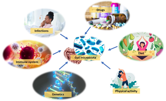 Multiple studies have indicated the significance of diet for the microbial composition. One of the examples is to stop breastfeeding for infant when reaching a certain age, a requirement for the maturation of the infant microbiota towards an adult-like structure fortified in Bacteroides, Bilophila, Clostridium, Roseburia, and Anaerostipes . With adults, the diet is closely related to gut microbiome com­position, and shifting from animal-based to plant-based diet can cause instant and significant changes in the gut microbiota. These changes depend on differences in the microbes’ capability in utilizing and metabolizing dietary components to serve their growth. On the other hand, even if short-term timeframe, radical changes in the diet can cause rapid changes in mi­crobial composition. In addition, mild changes in diet can only result in slight changes in the gut microbiome. Other fac­tors such as immune system, physical activity, infections, in addition to antibiotics and other medications, can also impact gut microbial composition. Moreover, host genetics have been shown to play a role as well. The gut microbiota composition was observed to be more similar among twins compared with unrelated in­dividuals, and monozygotic twin pairs was observed to have more similar microbiotas compared to dizygotic twin pairs. Nevertheless, the impact of host genetics in shaping the gut microbiota is quite small, generally, environmental factors are more dom­inant factors yet explaining somewhat little vari­ations in the microbiome.
