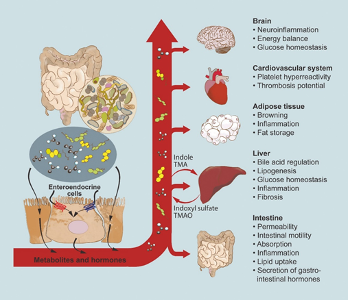 The gut microbiota utilizes local metabolic effects within the gut, where it impacts the ability to digest, ex­tracting energy and nutrients, and excreting byproducts from ingested food. The functions are regulated by the microbiota include intestinal permeability and motility, and generation of gut hormones. On the other hand, the gut micro­biota does not only have local impacts in the intestine (Figure 3). The microbes generate multiple small molecules that can impact the host’s physiology, both in the intestine and in other organs, adipose tissues, liver, skeletal muscles, immune system, brain.