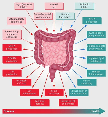 Figure 4 Schematic representation of the role of the gut microbiota in health and disease giving some examples of inputs and outputs. CVD=cardiovascular disease; IPA=indole propionic acid; LPS=lipopolysaccharide; SCFA=short chain fatty acids; TMAO=trimethylamine N-oxide (adapted from Science and Politics in Nutrition, BMJ).