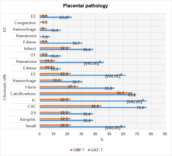 After the collection and pathological analysis of placentas, a significant increase was found in small chorionic villi GAF-T (61.5 vs 22.2%), IC (76.9 vs 22.2%), EE (61.5 vs 22.2%) and hematomas (46.1 vs 11.1%), compared to GAF-T. In addition, numerical increase in GAF-T of atrophic chorionic villi (38.4 vs 22.2%), DS (38.4 vs 22.2%), CDC (76.9 vs 44.4%), fibrin (53.8 vs 27.7%), hemorrhage (30.7 vs 16.6%), edema (15.3 vs 11.1%), OT (15.3 vs 5.5%) and infarct (38.4 vs 22.2%), compared to GMf-T (Graph 3).