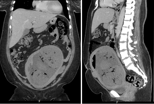 Figure 3 Patient Number 1, Computerized Tomography of Abdomen and Pelvis, coronal and sagittal view: Enlarged heterogenous multilobular masses within uterus, measuring 20 x 11.4 cm, consistent with Infarcted fibroid after embolization with internal gas, air and debris as expected after uterine artery embolization (UAE).