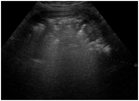 Figure 6 Patient Number 2, Transvaginal ultrasound: enlarged heterogeneous uterus measuring 14.8 x 13.5 by 20 cm with possible air within the substance of the uterus, raising the concern for infection.