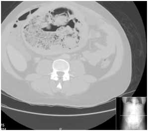 Figure 2 Patient Number 1, Computerized Tomography of Abdomen and Pelvis, Axial View: enlarged heterogenous multilobular masses within uterus, measuring 20 x 11.4 cm, consistent with Infarcted fibroid after embolization with internal gas, air and debris as expected after uterine artery embolization (UAE).