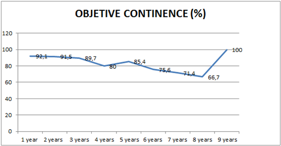 After analyzing different variables and their association with the risk of recurrence, a decrease in the total cure rate (mean rate 83.6%) and objective continence (cough test or telephone survey with SUI symptoms) was observed as the time since surgery increased.