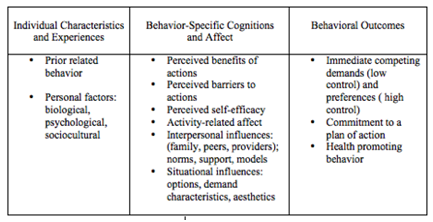 Dr. Pender utilized this model for helping adolescents adopt physically active lifestyles, so it could very well be utilized for healthy teen pregnancy promotion, support and education.