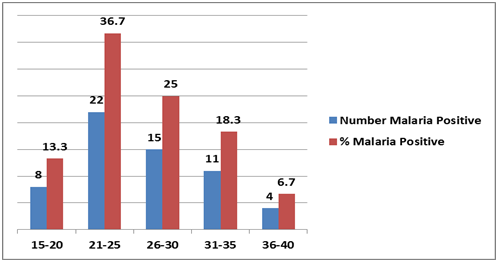 We observed that younger women in the age group 21-25 years constituted a significant number of the subjects (36.7%) compared to older age group 36-40 (6.7%). This finding is consistent with a previous report by Uneke and Colleagues13 which indicated that individuals of age group 20-24 years had the highest prevalence of maternal malaria (52%) while the least was recorded among those >40 years. Our finding is also in agreement with previous report which indicated that pregnant woman of younger maternal age is at a greatest risk of malaria infection as well as having higher parasite densities.14–17 Several factors may be responsible for this younger maternal age-related predisposition to malaria; general immune suppression and loss of acquired immunity to malaria.18,19
