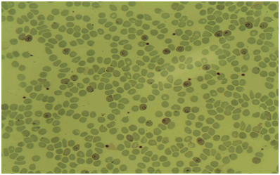 Table 1 presents the socio-demographic characteristics of the Malaria parasitized pregnant subjects and controls. The prevalence of malaria was significantly higher in pregnant women resident in Urban area, those that do not use mosquito net, those that have no non-formal education and those that are not on prophylaxis medication (p<0.05). Age, ethnicity and occupation had no significant effect of the prevalence of malaria among pregnant women (p>0.05). Figure 1 shows the distribution of Malaria parasitaemia based of age. Figure 2 shows the distribution of Malaria parasitaemia among the subjects based on ethnicity. The predominant plasmodium specie responsible for all cases of malaria among the subjects was Plasmodium falciparum. Malaria prevalence was compared based on some socio-demographic factors among the subjects. Subjects residing in urban areas were more prone to malaria compared to those living in rural areas (X2=4.957, p=0.026). Figure 3 shows the distribution of Malaria parasitaemia among the subjects based on Residence. Pregnant women with no formal education were more predisposed to malaria infection compared to more educated women with primary, secondary and tertiary education (X2=9.040, p=0.029). Figure 4 shows the distribution of Malaria parasitaemia among the subjects based on Educational Status. Pregnant women who did not use insecticide- treated mosquito net was more predisposed to malaria compared to those that do (X2=32.105, p=0.0000). Figure 5 shows the distribution of Malaria parasitaemia among the subjects based on Occupational Groups. Pregnant women who are not on prophylactic antimalarial medication were more likely to have malaria compared to those that do (X2=18.281, p=0.0000). Figure 6 and Figure 7 shows the distribution of Malaria parasitaemia among the subjects based on use of insecticide treated mosquito nets and use of antimalaria prophylaxis respectively. Figure 8: Blood film from one of the subjects showing several ring forms of P. falciparum. Table 1 shows the Socio-demographic characteristics of subjects.