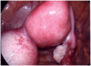 27 years old lady, para 2 reported with pain abdomen of many months duration. Pain was intermittent initially but had become almost continuous and was dull aching in character. She had two normal vaginal deliveries. Her general and systemic examination was normal. Gynecological examination revealed a normal size uterus with adnexal mass of 10 to 12 cm, globular mass which had restricted mobility. Ultrasound suggested large endometriotic cyst. She was posted for diagnostic laparoscopy which showed an enlarged and distended rudimentary horn on right side (Figure 3) (Figure 4). Since the mass was big size and endoscopic surgical expertise was not available, hence laparotomy was done and rudimentary horn along with ipsilateral fallopian tube was excised. The cavity contained a large quantity of chocolate material. She made an uneventful postoperative recovery.