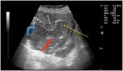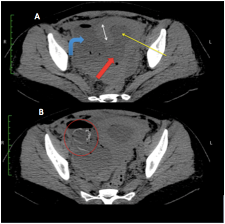 Non-contrast CT scan of pelvis (Figure 2A) confirmed the defect in right lateral wall of uterus (thick red arrow) with multiple loculated air containing collections in right adnexa (curved blue arrow) and endometrial cavity (thin yellow arrow). Right adnexa showed heterogeneous solid appearing mass with presumably fetal parts including head (red circle in Figure 2B).