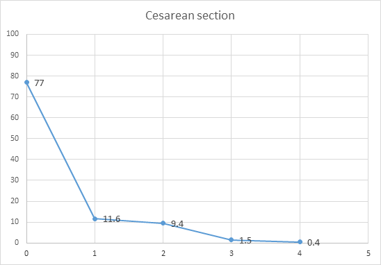 77% the women who took part in the survey did not have a caesarean section. The next highest percentage, i.e. 11.6%, concerns women who have delivered by caesarean section and the remaining options, i.e. 2 cesarean deliveries, 3 cesarean deliveries and 4 cesarean deliveries receive percentages of 9.4%, 1 .5% and 0.4%, respectively (Graph 2).