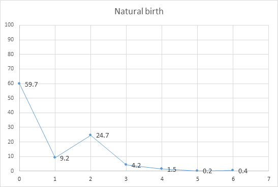 59.7% of the women who took part in the survey have not given birth by normal delivery. The next percentage, i.e. 24.7%, refers to women who have given birth naturally with 2 births and the remaining options, i.e. 1 natural birth, 3 natural births and 4 natural births receive percentages of 9.2%, 4.2% and 1 .5%, respectively (Graph 3).