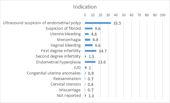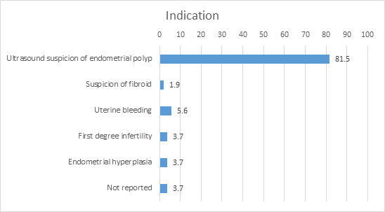 Patients came to the outpatient clinic with various indications. A simple assessment process was carried out during the history taking to more thoroughly record the symptoms. Therefore, the majority of women presented with ultrasound suspicion of endometrial polyp with a rate of 33.5%. Other indications with a significant percentage are primary infertility with a percentage of 14.7%, endometrial hyperplasia 13.6% and with a percentage of 9.6% the indication of suspected fibroid and vaginal bleeding during ultrasound procedure (Graph 4).