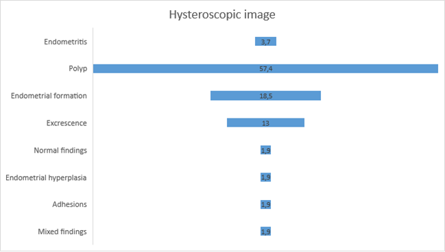 81,5% main ultra-sonographic indication presented as endometrial polyp, 5,6% as vaginal bleeding, 3,7% endometrial hyperplasia and 1,9% myomas suspicion respectively (Graph 6).
