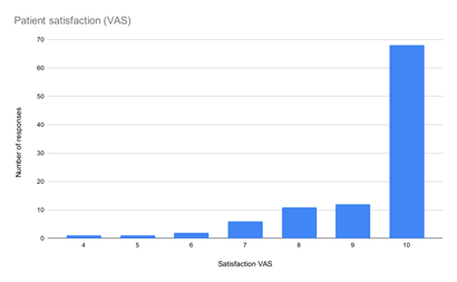 97% of patients felt very happy/happy with the phone consultation, 90% scored 8-10 on the VAS scale, and 86% wanted to keep the option long-term (Table 2) (Figure 2).