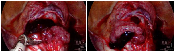 Figure 1 Intraoperative images of cesarean scar ectopic pregnancy; products of conception (POC) were noted and removed.